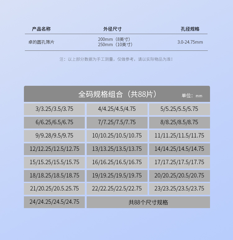 - 常規孔徑 3.0mm-20.0mm(65種規格)